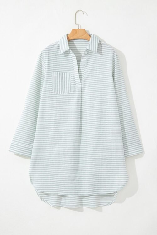 Cover-Ups | Women White Stripe Collared V Neck Chest Pocket Long Sleeve Beach Cover Up