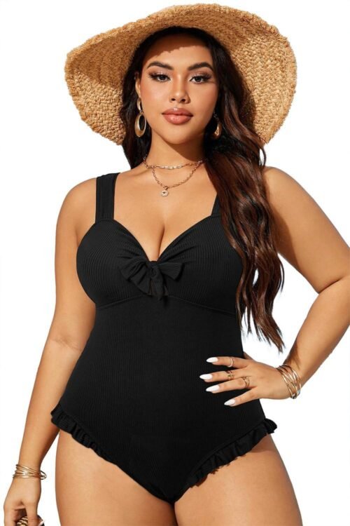 One-Piece | Women Black Plus Size Textured Knot Ruffle Trim One Piece Swimwear