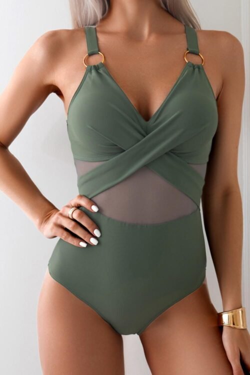 One-Piece | Women Green Bay Criss Cross V Neck Mesh One Piece Swimsuit