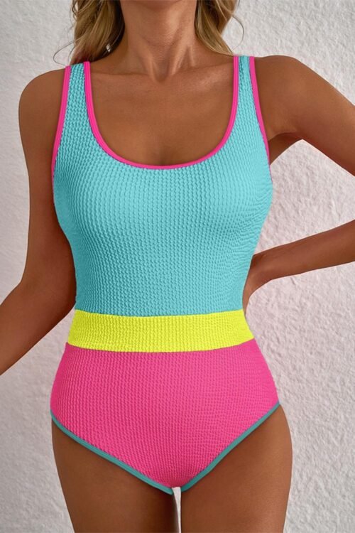 One-Piece | Women Rose Red Textured Colorblock One Piece Swimsuit