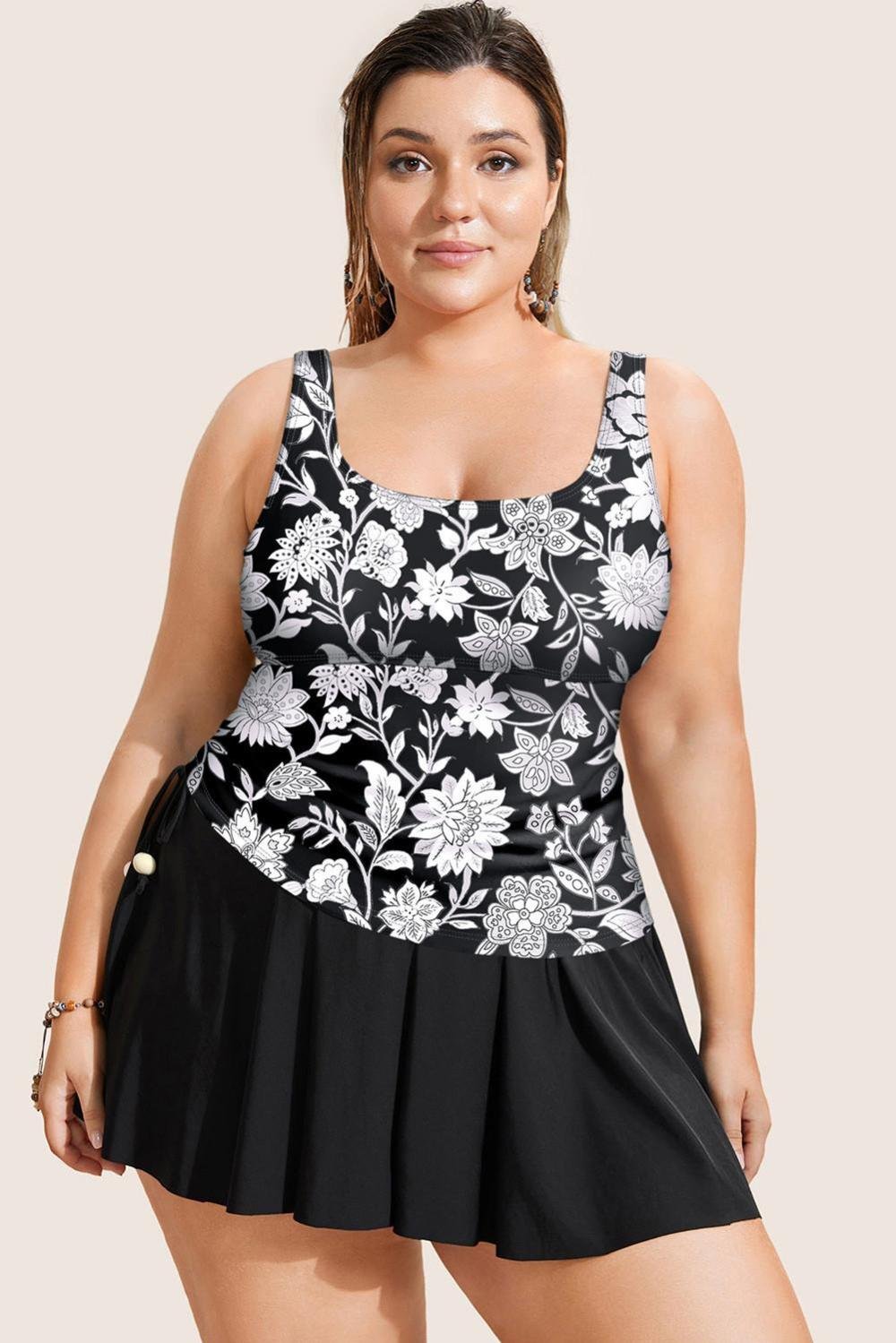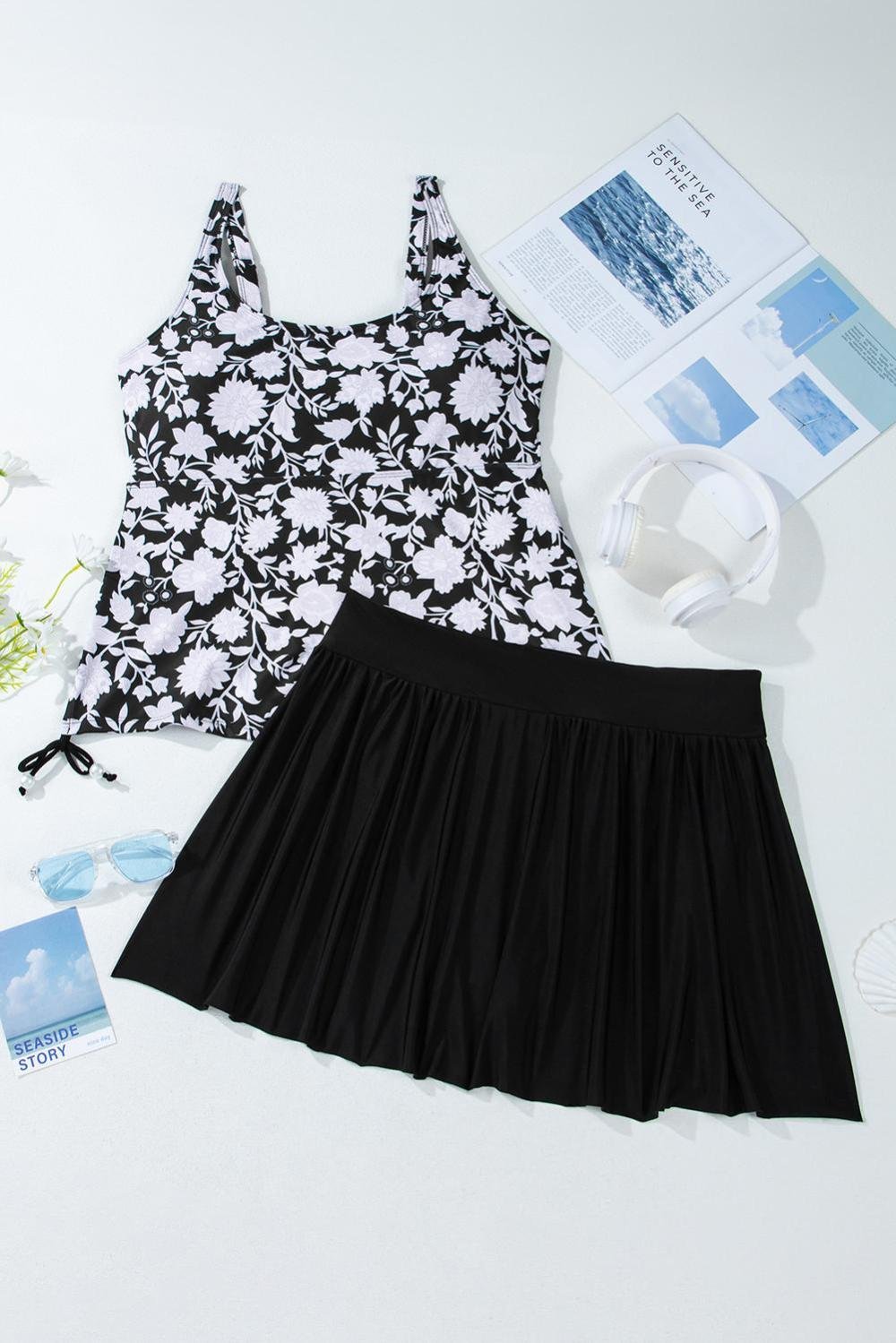 Tankinis | Women Black Plus Size Floral Print Drawstring Ruffled Tankini Set